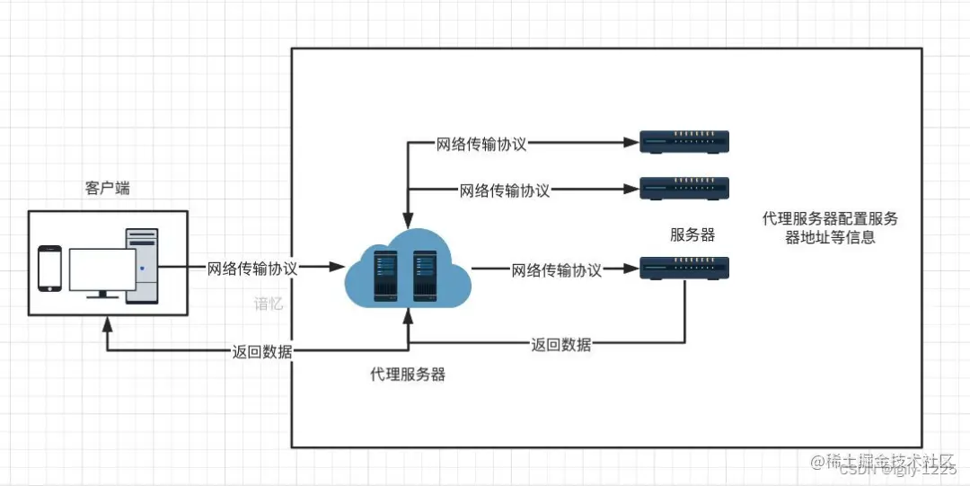 服务器根据客户端的请求,从其关系的一组或多组后端服务器(如Web服务器)上获取资源,然后再将这些资源返回给客户端,客户端只会得知代理服务器的IP地址,而不知道在代理服务器后面的服务器集群的存在。