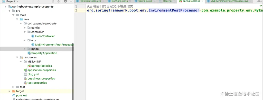 接着,在resources资源目录下,我们还需要创建一个文件META-INF/spring.factories,通过spi方式,将自定义环境处理类加载到Spring处理器里面,当项目启动时,会自动调用这个类!