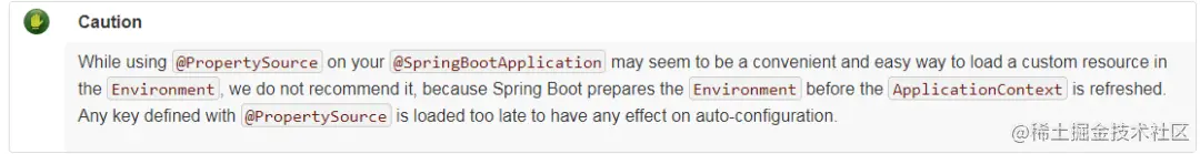 虽然在@SpringBootApplication上使用@PropertySource似乎是在环境中加载自定义资源的一种方便而简单的方法,但我们不推荐使用它,因为SpringBoot在刷新应用程序上下文之前就准备好了环境。使用@PropertySource定义的任何键都加载得太晚,无法对自动配置产生任何影响。