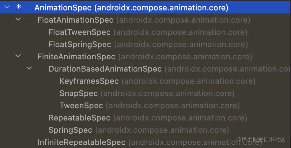 那么是要我们自己去实现这个接口去对动画进行配置么?当然可以,但这样太麻烦了,Compose 提供了一系列预置的实现类帮助我们对动画的常用配置项进行设置。来看一下 AnimationSpec到底有哪些预置的实现类,如图: