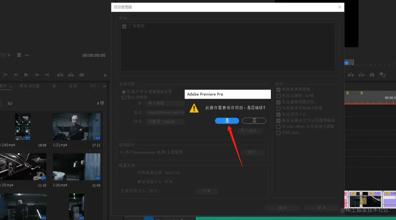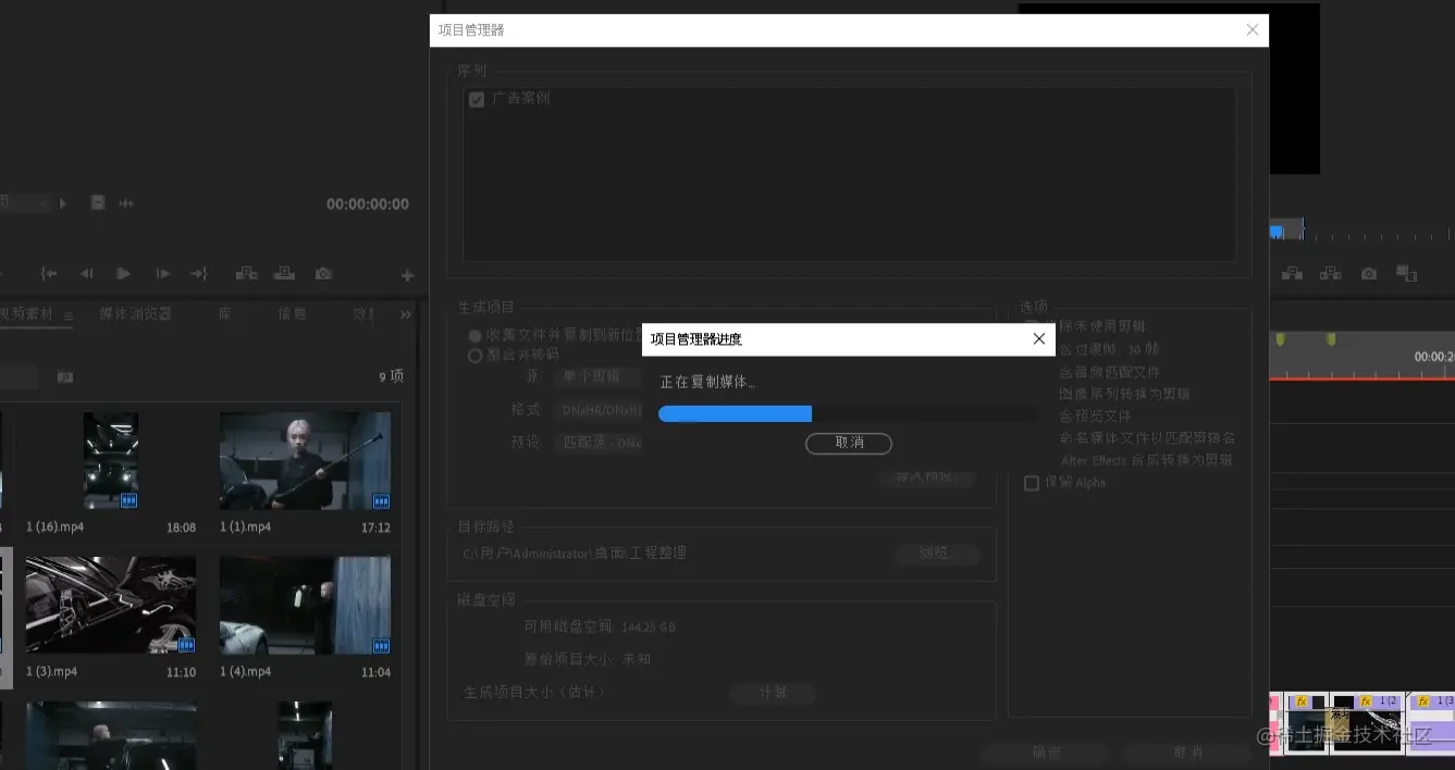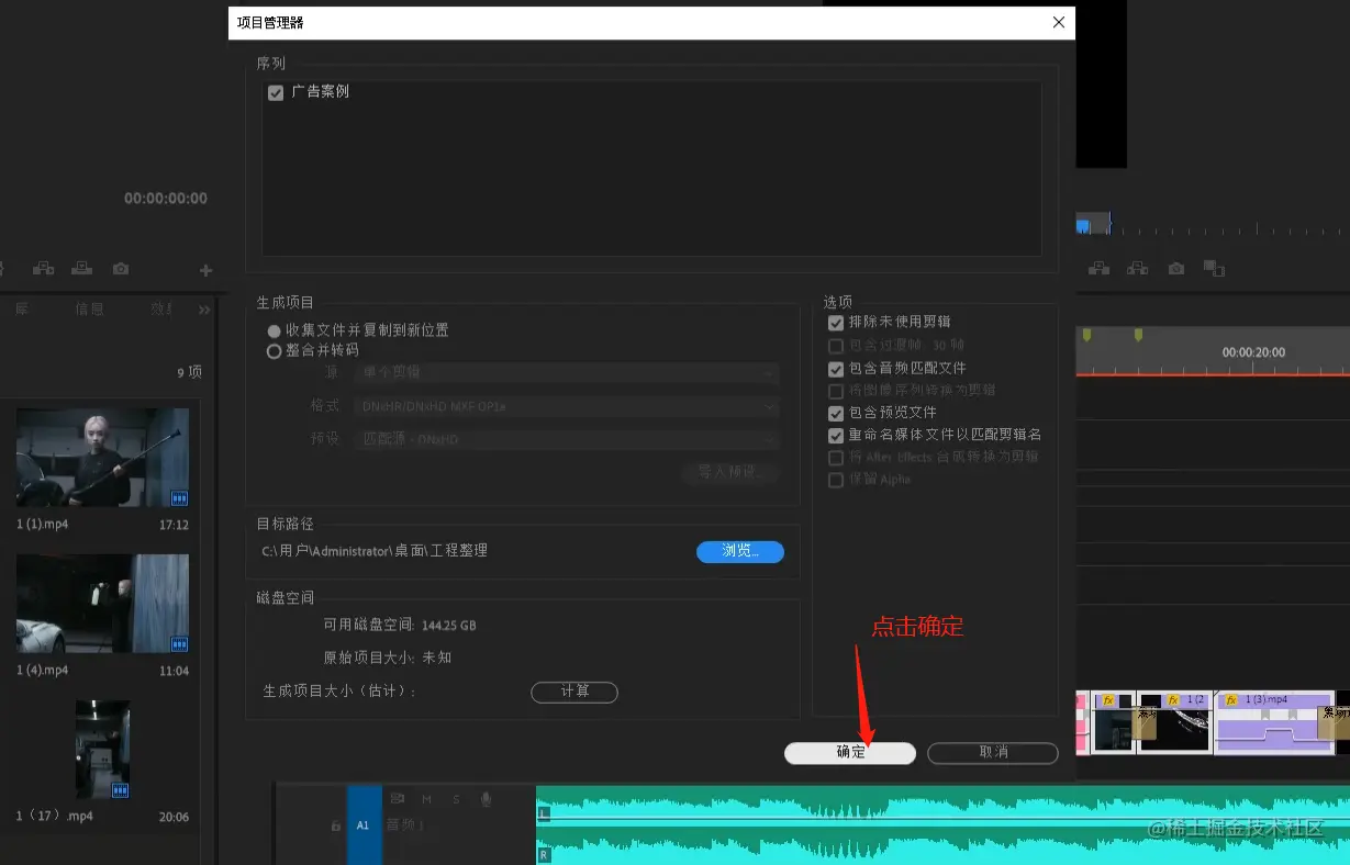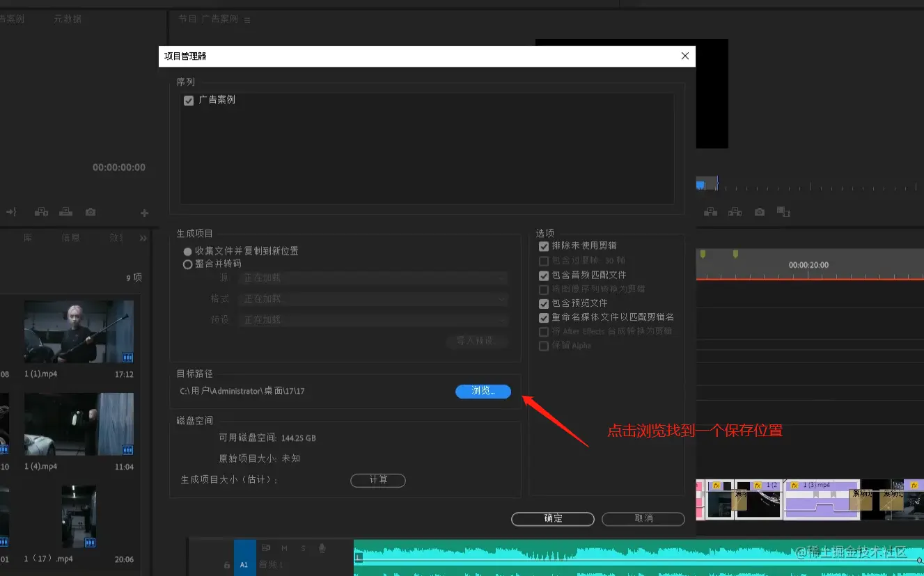 - 这时会弹出项目管理面板-勾选广告案例-点击浏览找到一个存储位置
