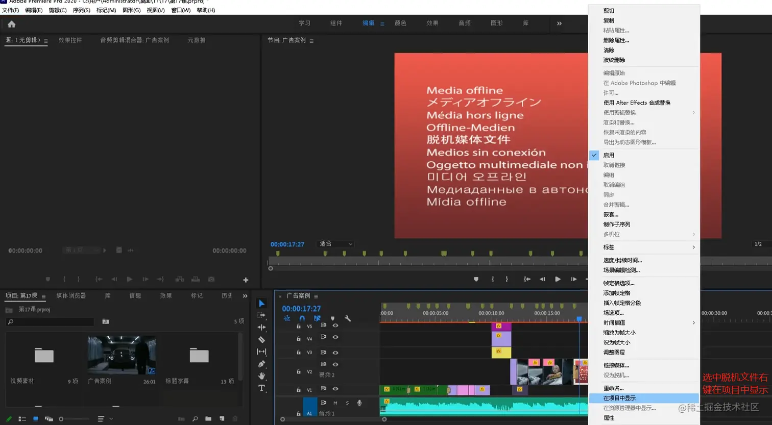 - 在时间线面板上选择脱机文件右键-在项目中显示