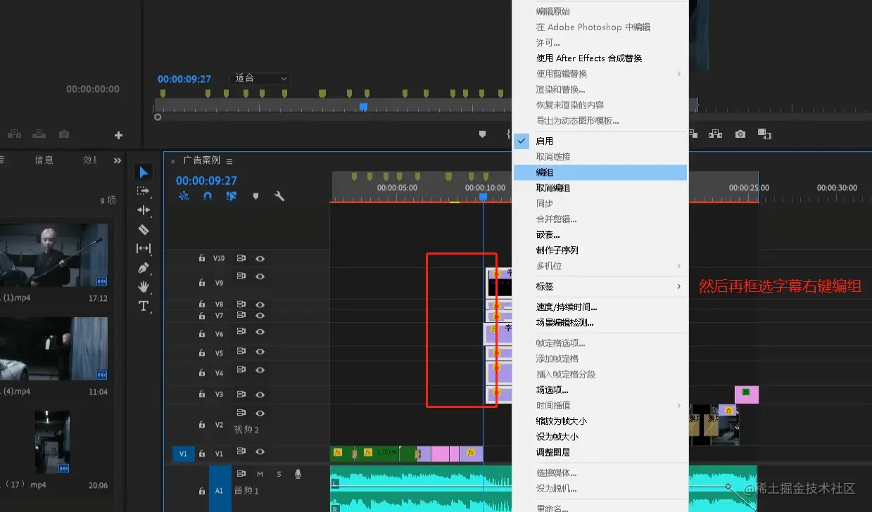 - 设置完颜色后再次框选所有字幕文件点击右键编辑编组将同类素材放在一起