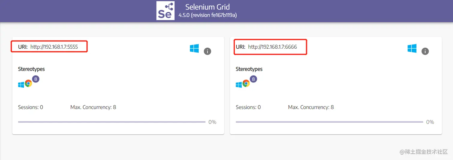 再次查看selenium Grid界面,就可以看到多个不同端口的node节点被添加进来了(实际使用过程中,可以在不同操作系统不同设备上启动node并添加到hub上)。