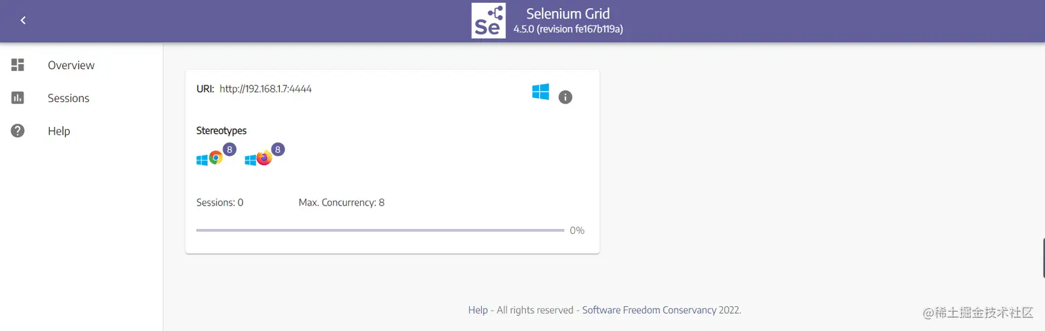 http://192.168.1.7:4444,可以看到selenium Grid的可视化界面。可以看到目前已经检测到了Windows操作系统上的两个浏览器,Chrome和Firefox。