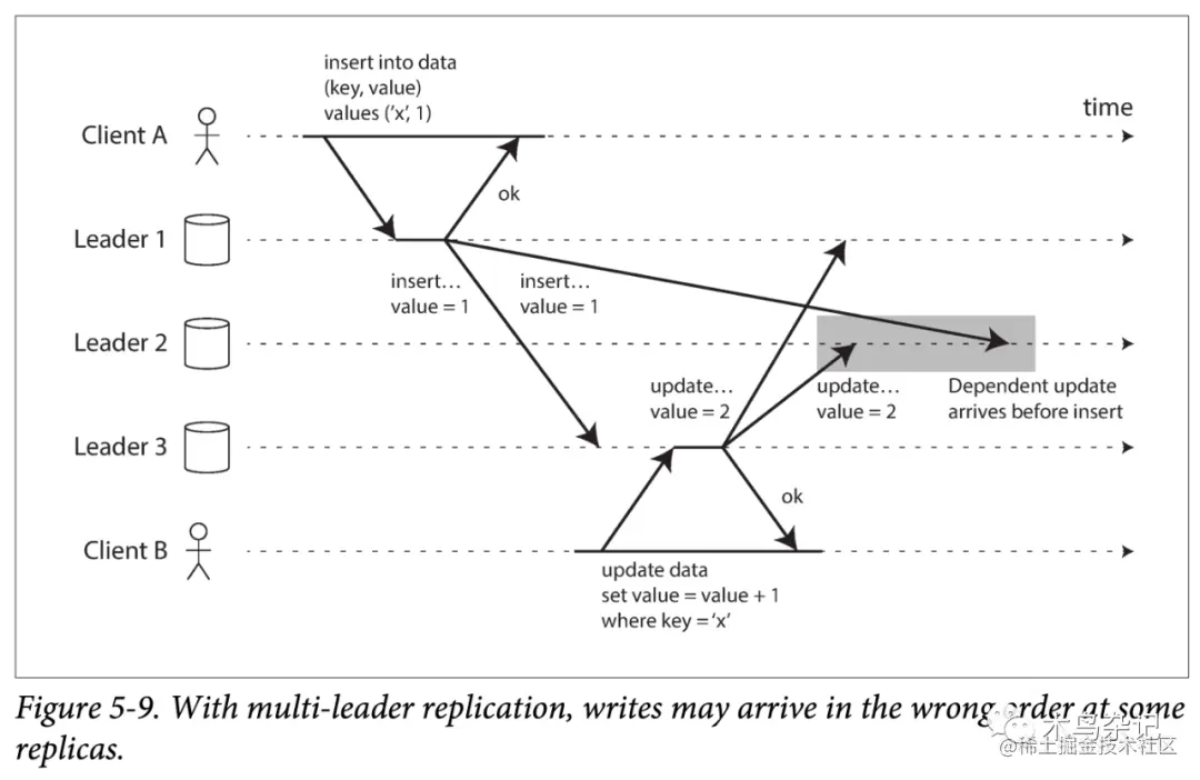 两个有因果依赖的(先插入,后更新)的语句,在复制到 Leader 2 时,由于速度不同,导致其接收到的数据违反了因果一致性。