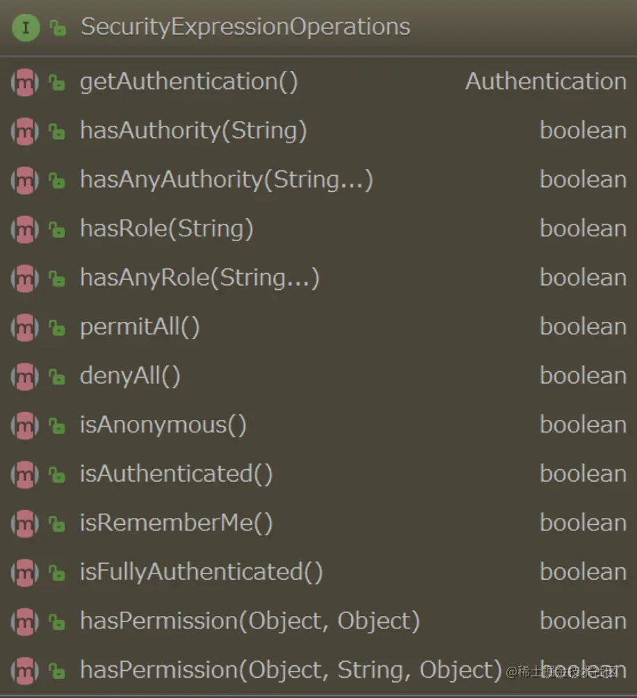 在Spring Security中,有一个SecurityExpressionOperations接口,在该接口中定义了一系列的方法,用于用户权限的设置,如下图: