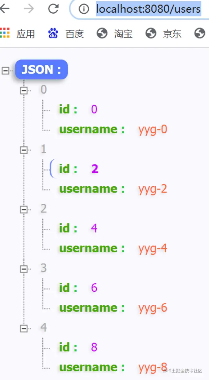 我们启动浏览器进行测试,可以看到测试接口中只返回id为偶数的元素。