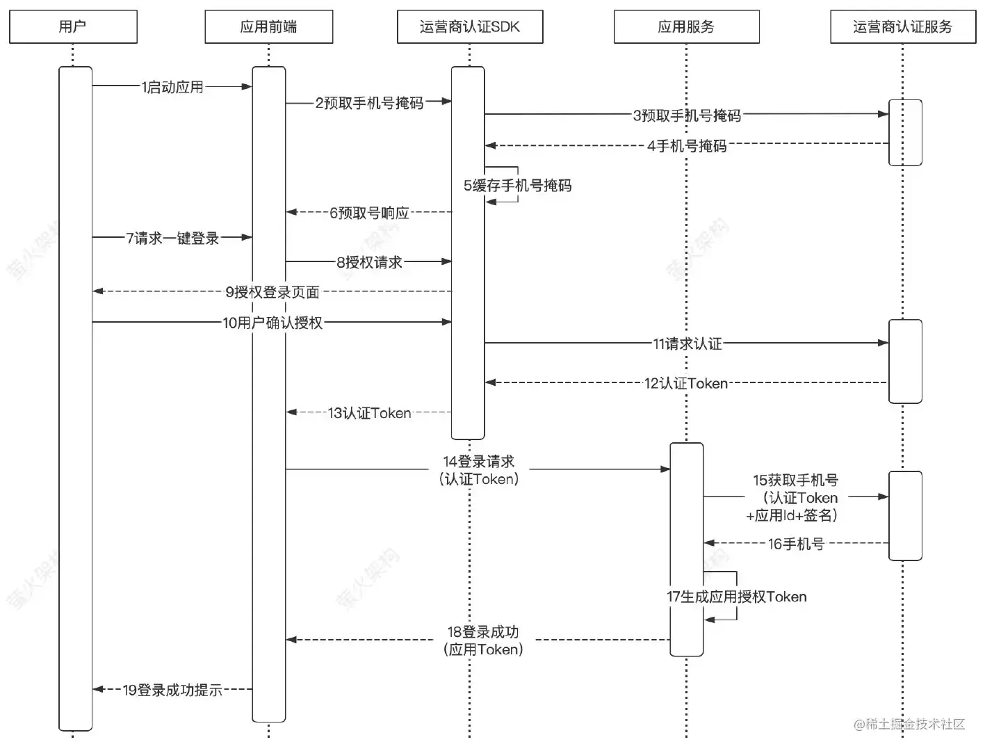 首先需要 app 端拿到认证的 Token ,然后把这个 token 发给后端,我们需要做的是,使用这个 token 去发送请求,获取实际手机号,获取到手机号后,进行登录 / 注册的流程,然后系统生成用户 token,发给 app 端,这样就登录成功了。