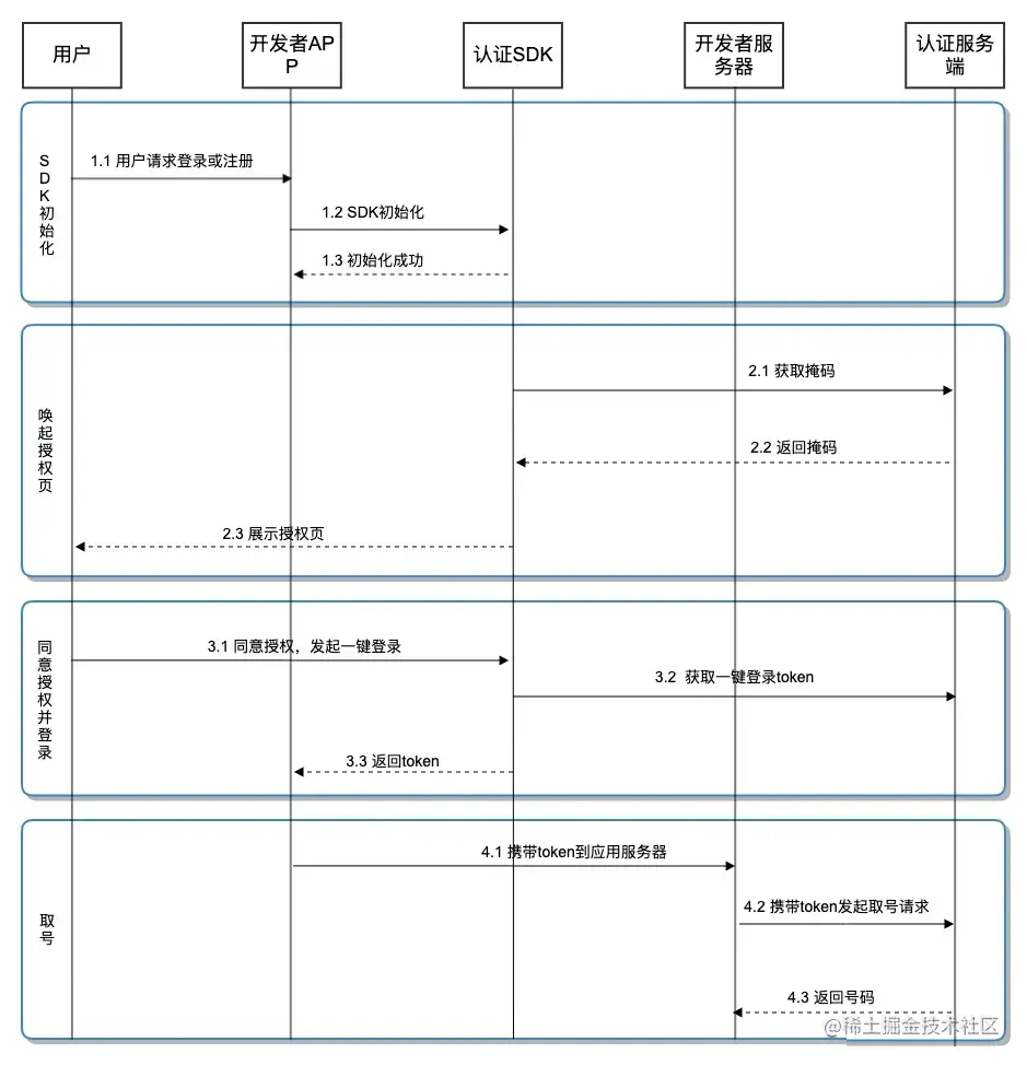 整个流程:SDK初始化 -> 唤起授权页面 -> 同意授权并登录 -> 取号(获取手机号码) -> 登录成功