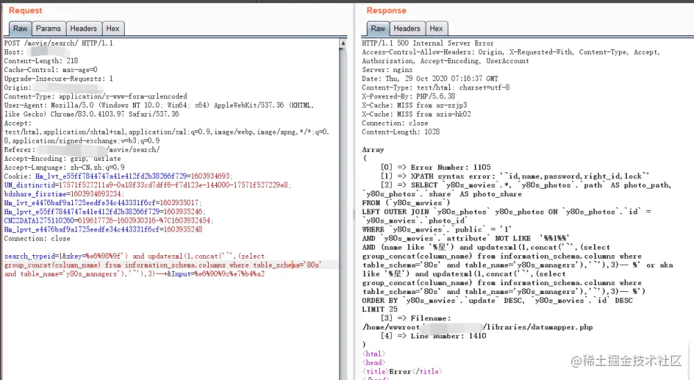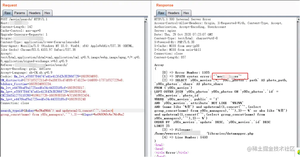 通过union或者updatexml进行查询,内容有回显,一开始我并不知道的,后面通过百度查询到了updatexml用法,于是自己构造了个: