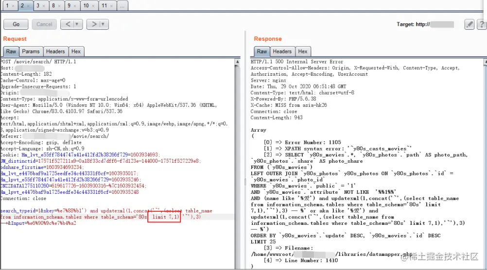 看Y80应该可以明显感觉断了,及时看不出来,也不应该就这几个表吧!这时候想到,我们岂不是可以通过limit限制内容,把已经看到了的不输出,我真是天才,然后我构造了payload: