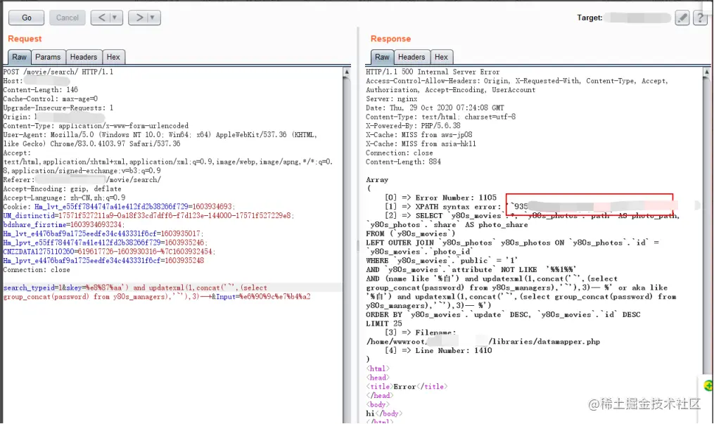 忘记这个是有限制字段的,也没注意看是否是以~结尾,然后拿去md5解密,发现解不开,数了一下,31位的md5?这时候才发现,后面还有。于是使用substr函数,去截取后面的字段,回显!