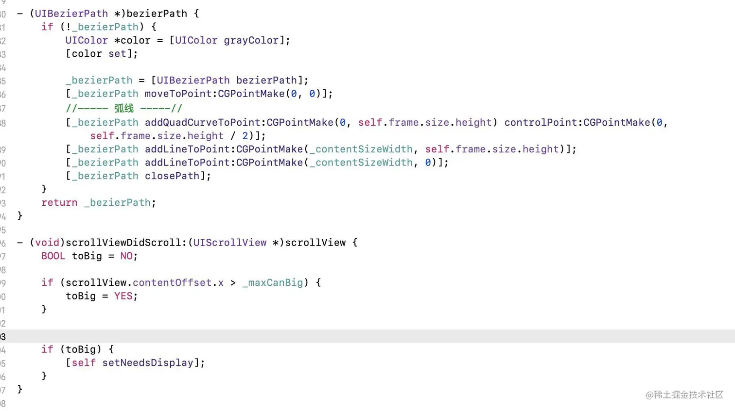 思路就是在滚动视图的末尾画出一个矩形,然后在滚动到合适的位置的时候触发形变