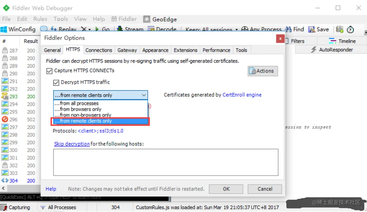 2.打开fiddler>Tools>Fiddler Options>HTTPS>…from remote clients only,勾选这个选项就可以了