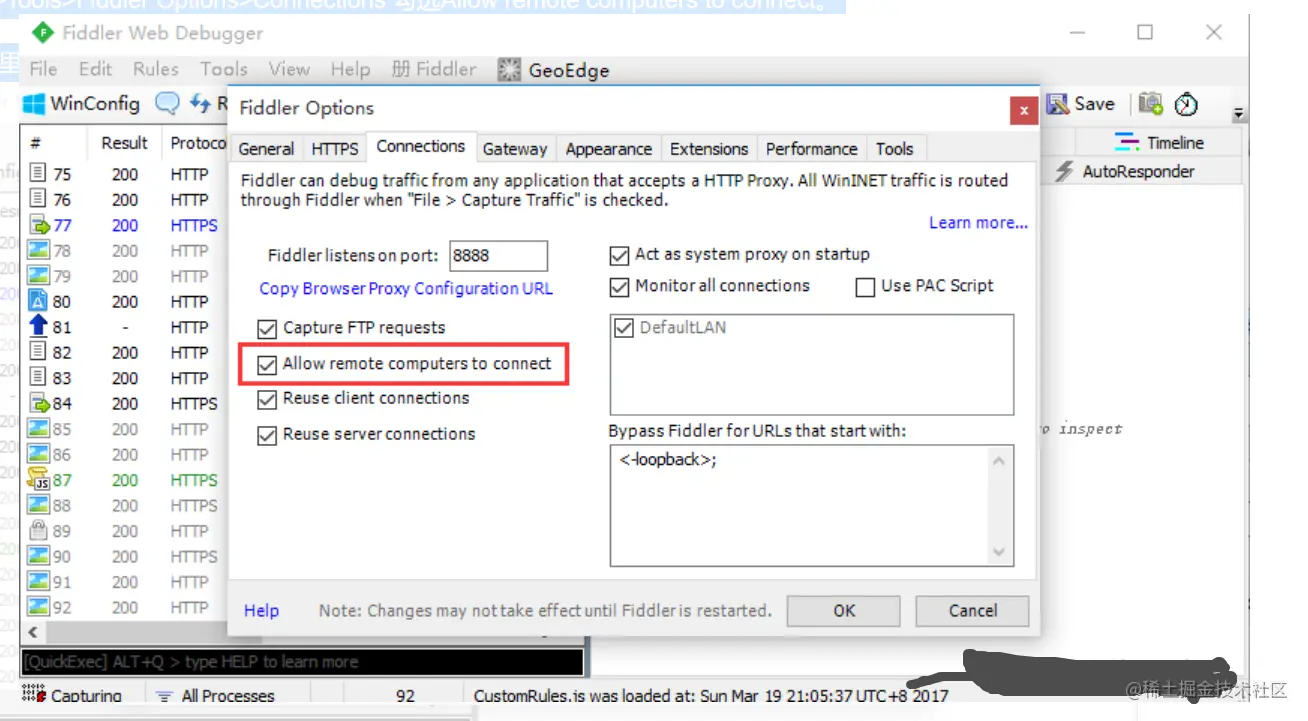 1.fiddler>Tools>Fiddler Options>Connections 勾选Allow remote computers to connect。