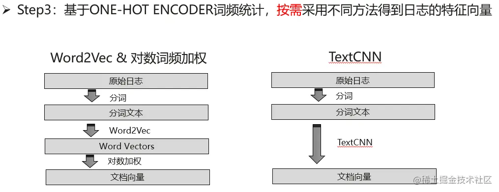 日志文本特征向量构建主要选取了基于word2vec的向量化方法和基于TextCNN的向量化方法来。日志文档特征向量是利用word2vec方法生成的词向量与对数词频加权平均后的结果,以及TextCNN直接生成文档向量。