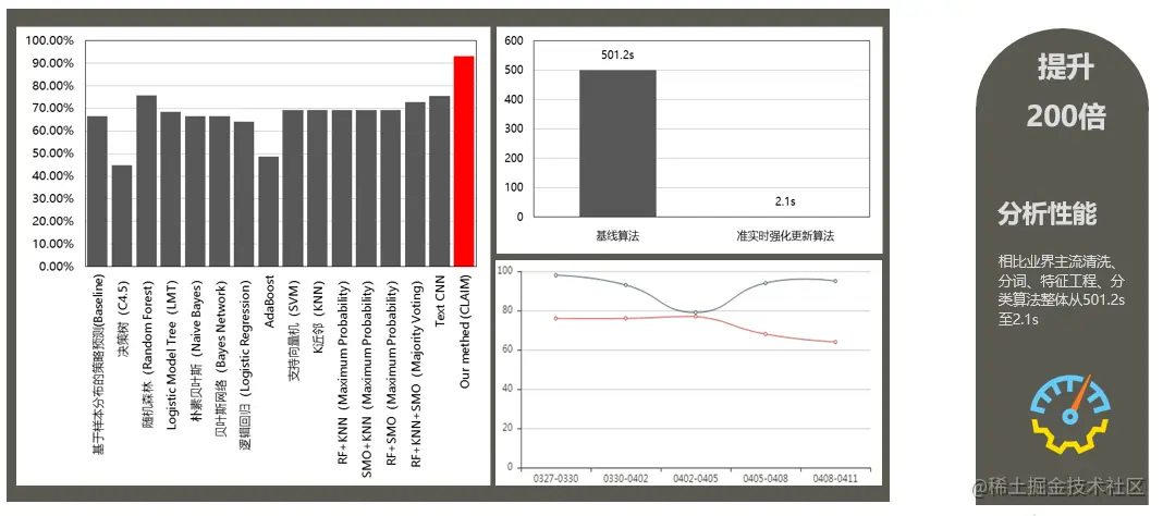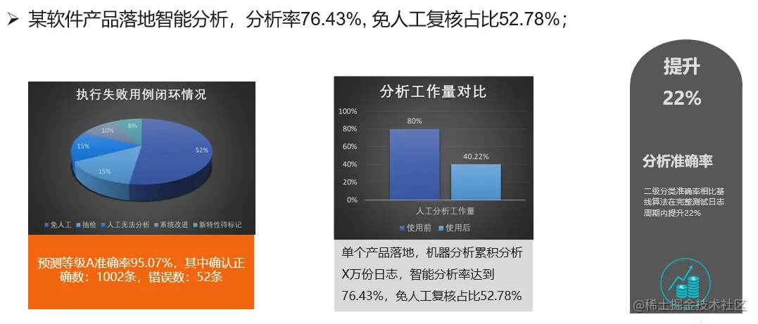 相比于业界主流方法,该模型的分析准确率能够达到90%以上,算法时间整体从501.2s提升在2.1s左右。另外智能分析模型在某产品落地时,免人工复核占比52.78%。