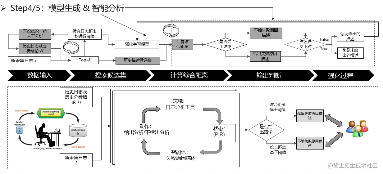 模型生成与智能分析主要是结合了强化学习和主动学习,来对是否给出正确预测进行奖罚。对于新采集到的日志,会跟日志库中的数据进行比较,选出top-k个距离最近的日志样本,若距离超出一定阈值,则不给出分析结论,若符合阈值内的样本则加入候选集中,并且强化学习模型会计算候选集的得分,根据得分判断是否给出失败原因描述。最后由人工去确认失败原因是否正确以此是否做出奖励或惩罚,从而不断优化强化学习模型。