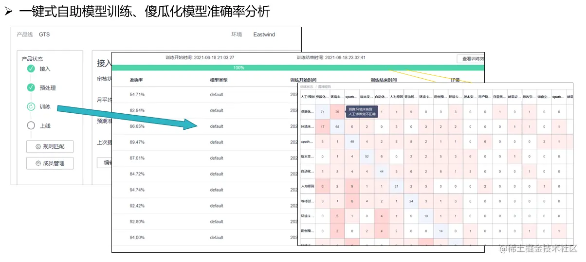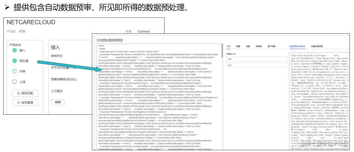 测试日志智能分析已经落地华为100多个产品线,为用户提供了自主接入、自主训练、结果分析的功能:提供自动的预处理规则管理、预处理效果展示,支持用户一键式自助训练模型,观测模型分析准确率与结果。