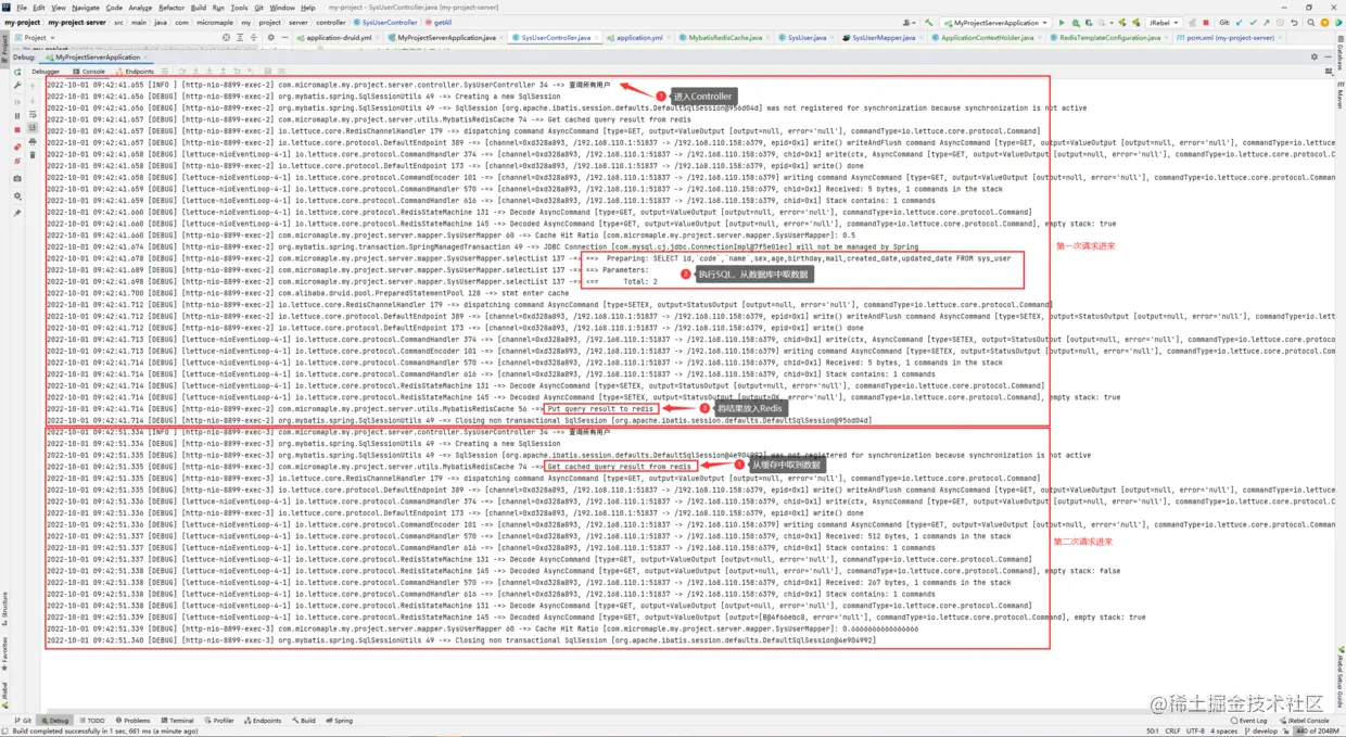 接着,我们再次访问查询所有用户接口,我们可以在控制台日志中看到,第二次查询并没有走数据库,而是直接在Redis中取出来了