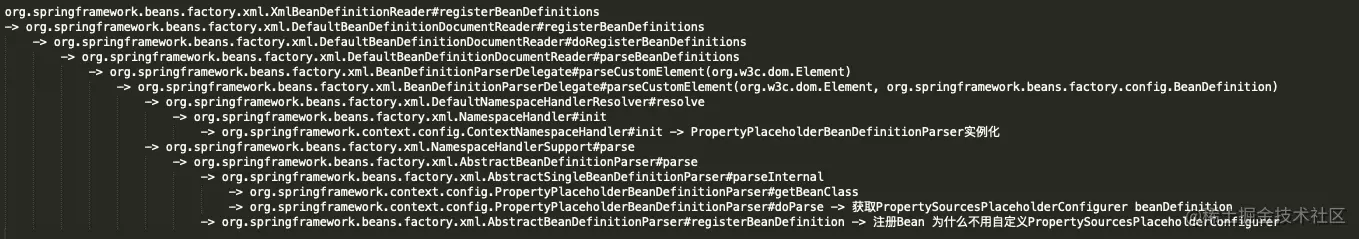 这里再看一下上述两种xml配置,第二种配置很好理解,我们显式声明了PropertySourcesPlaceholderConfigurer,但是第一种方式我们并没有显式声明该bean,那么PropertySourcesPlaceholderConfigurer实体bean如何生成的?