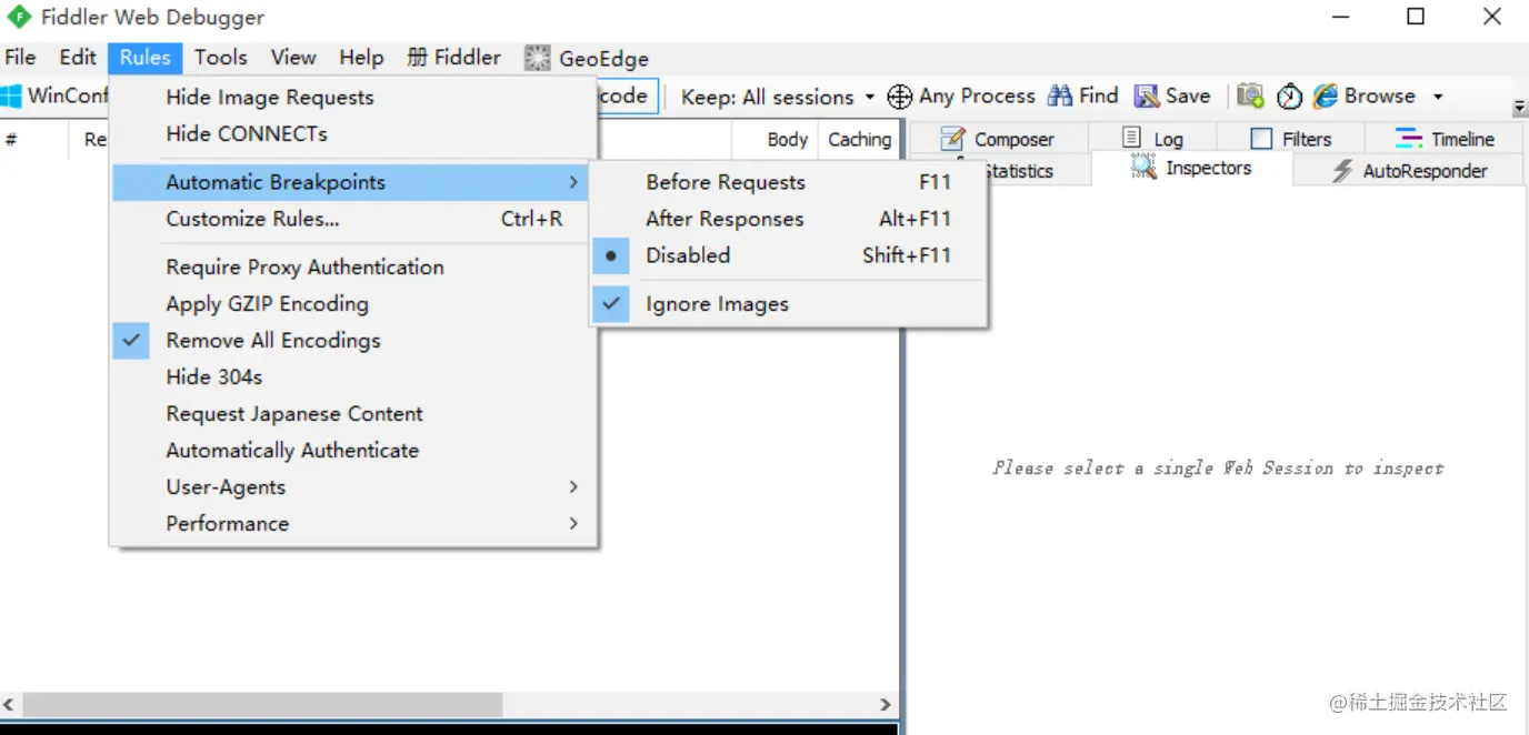 6.打全局断点的话,是无法正常上网的,需要清除断点:rules-> automatic breakpoint ->disabled