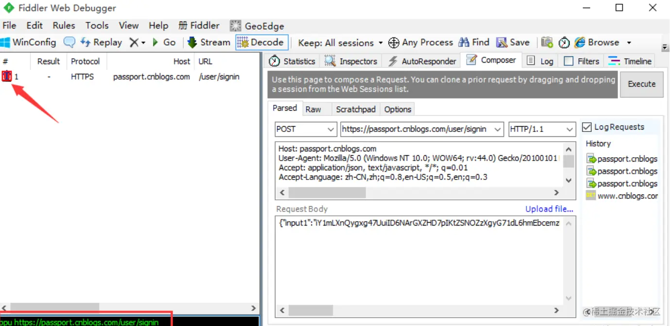 3.登录博客园,会发现已经拦截到登录后服务器返回的数据了,此时可以修改任意返回数据