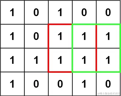输入: matrix = [["1","0","1","0","0"],["1","0","1","1","1"],["1","1","1","1","1"],["1","0","0","1","0"]]