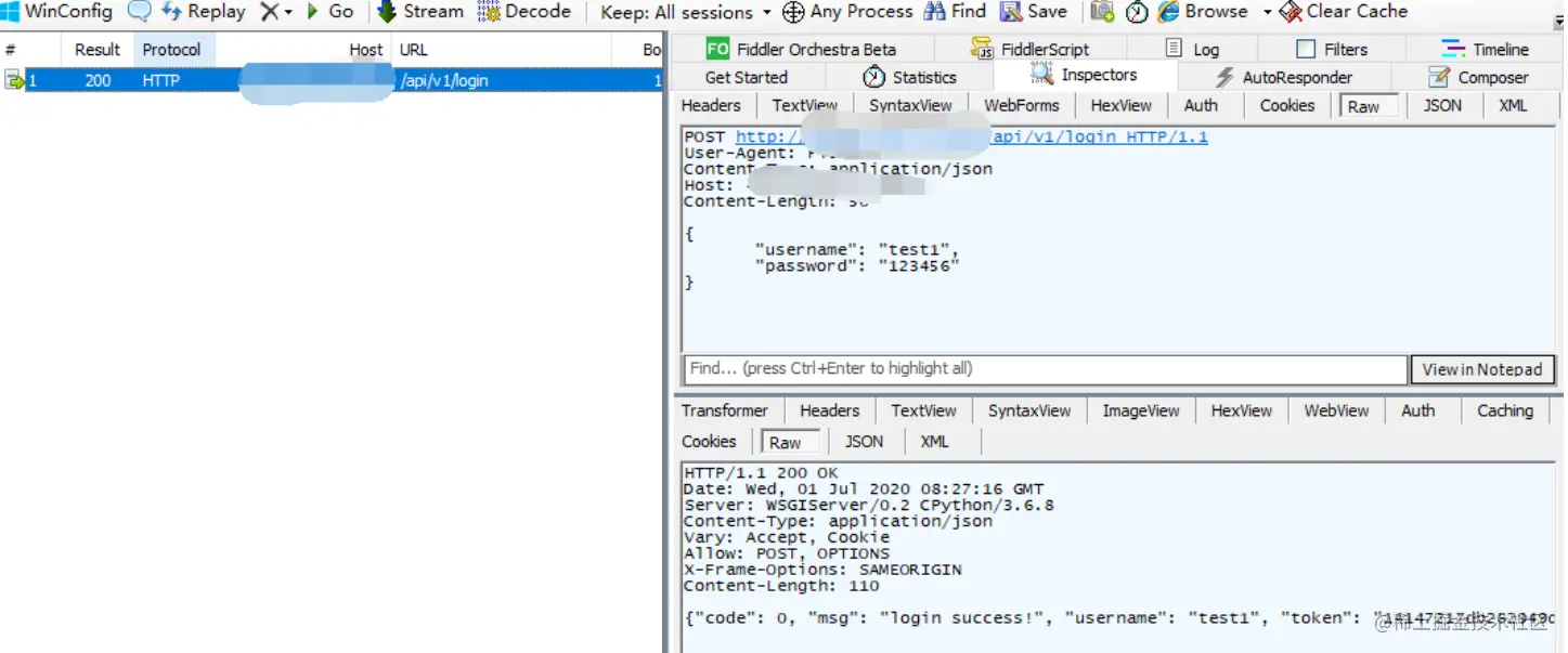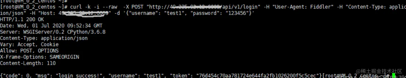 curl -k -i --raw -X POST "http://49.x.x.x:6000/api/v1/login" -H "User-Agent: Fiddler" -H "Content-Type: application/json" -H "Host: 49.x.x.x:6000" -d '{"username": "test1", "password": "123456"}'