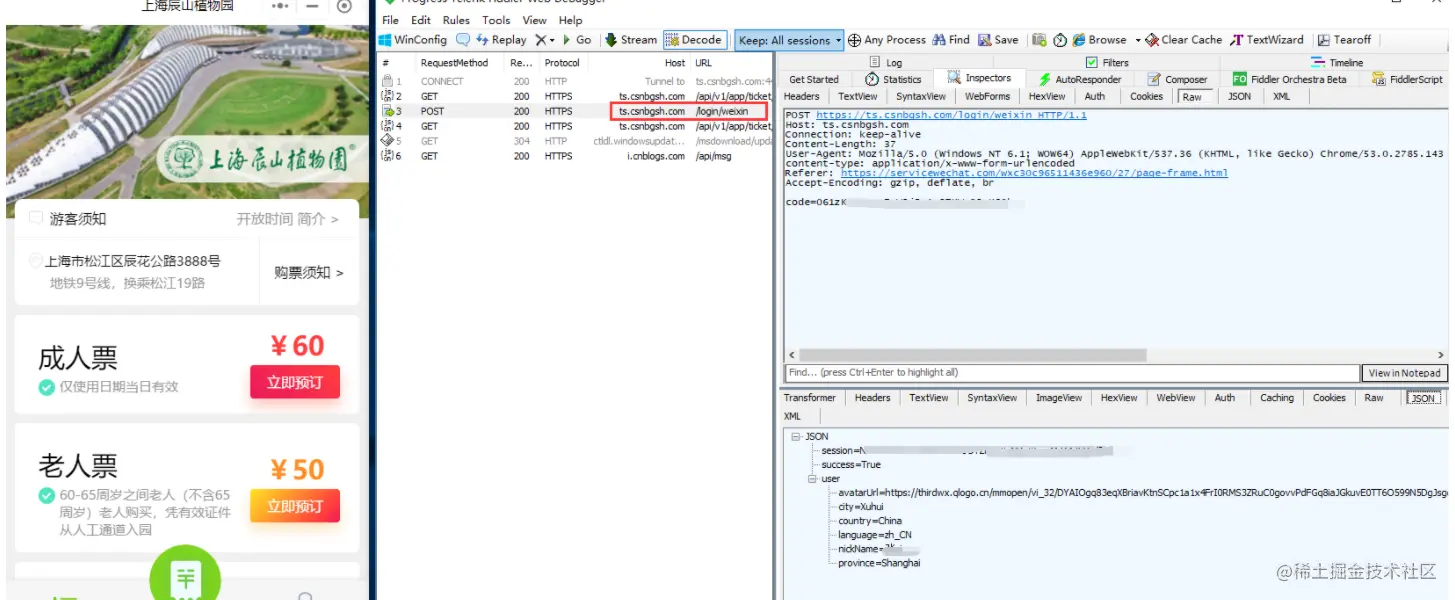选一个你要抓包的小程序-辰山植物园,打开fiddler 后,登录小程序就能抓到了