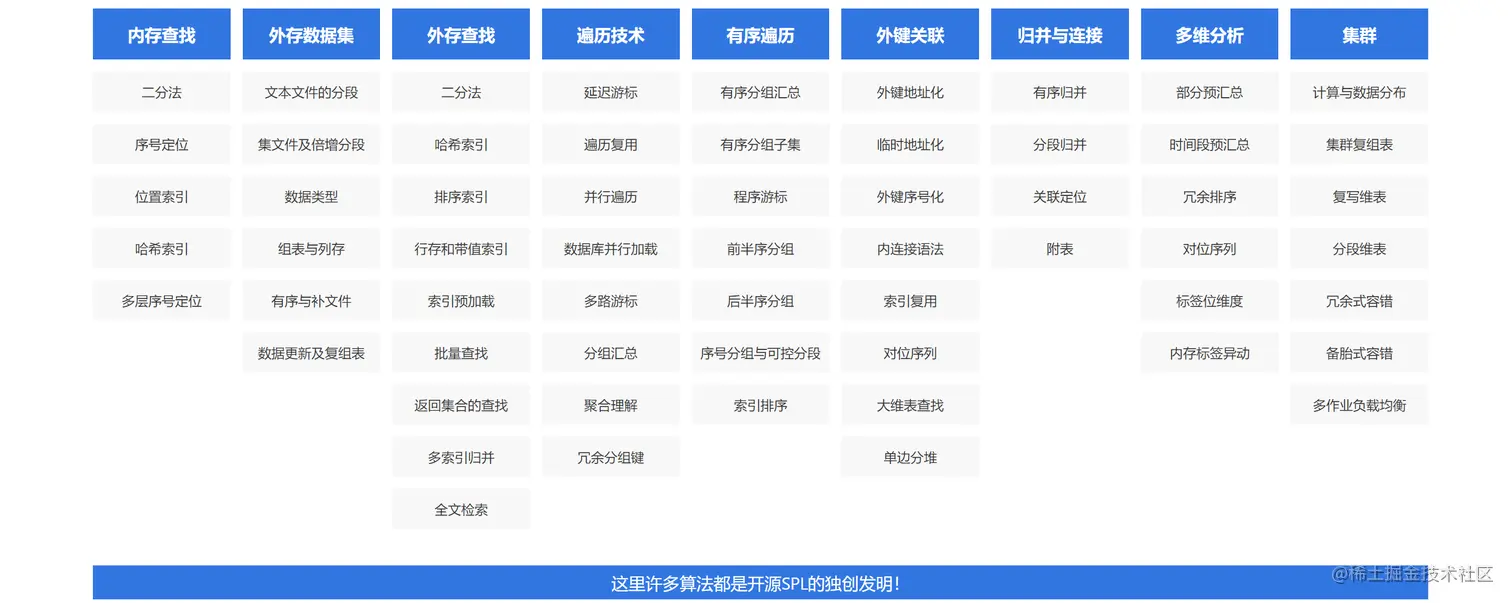 下面再来看计算的过程。SPL提供了更优的算法(有许多是业界首创),计算性能远远超过存储过程和SQL语句。这些高性能算法包括: