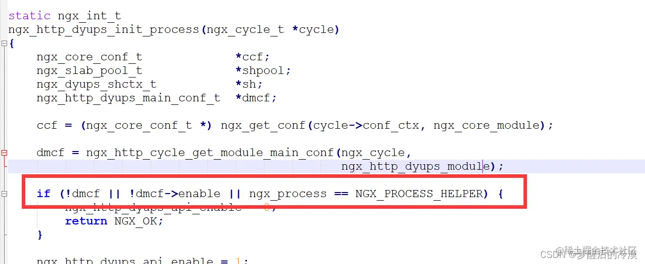 修改前代码 if (!dmcf || !dmcf->enable || ngx_process == NGX_PROCESS_HELPER) {