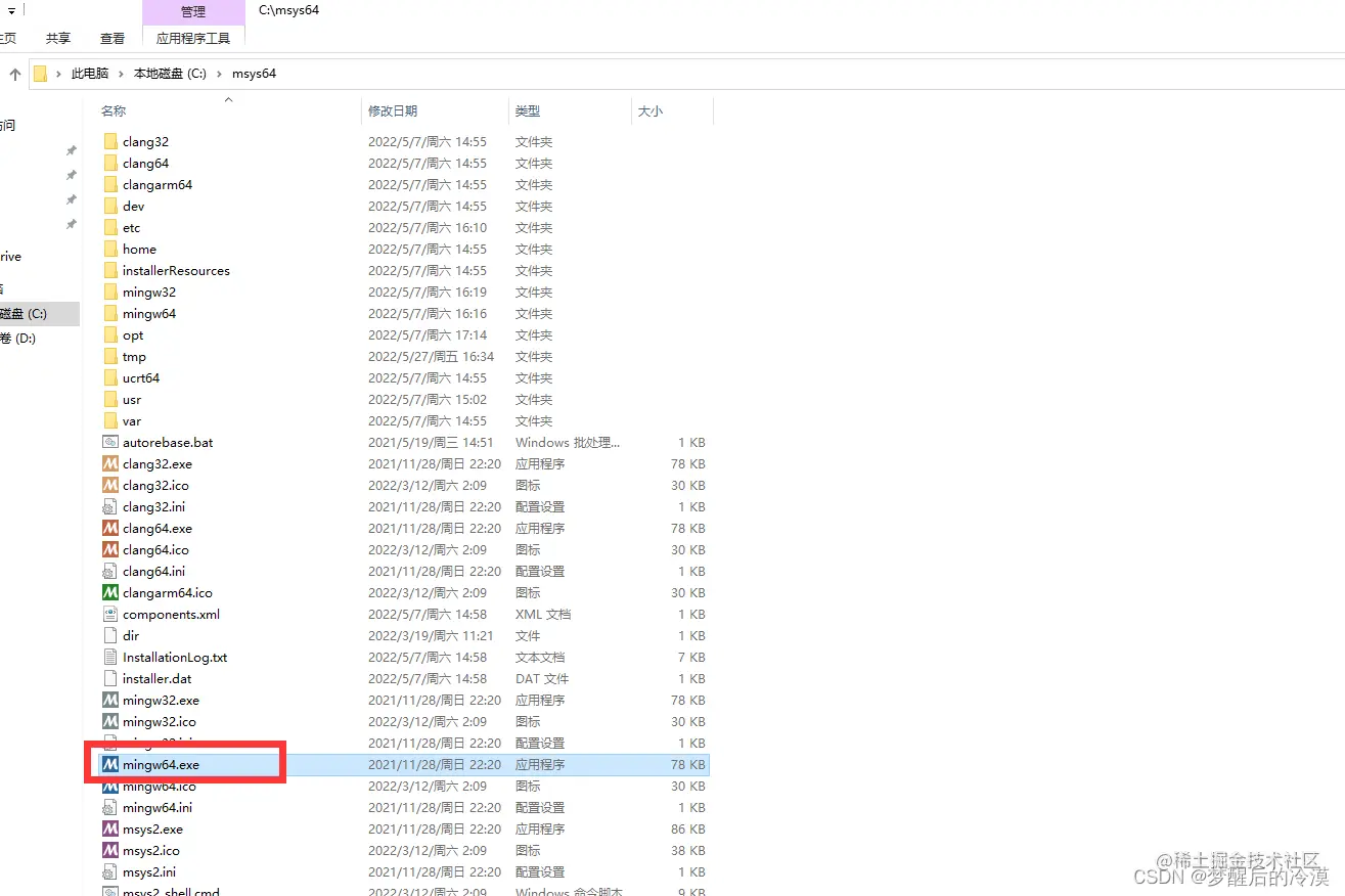 1.到MSYS2的根目录,点击mingw64.exe,因为我是64位系统