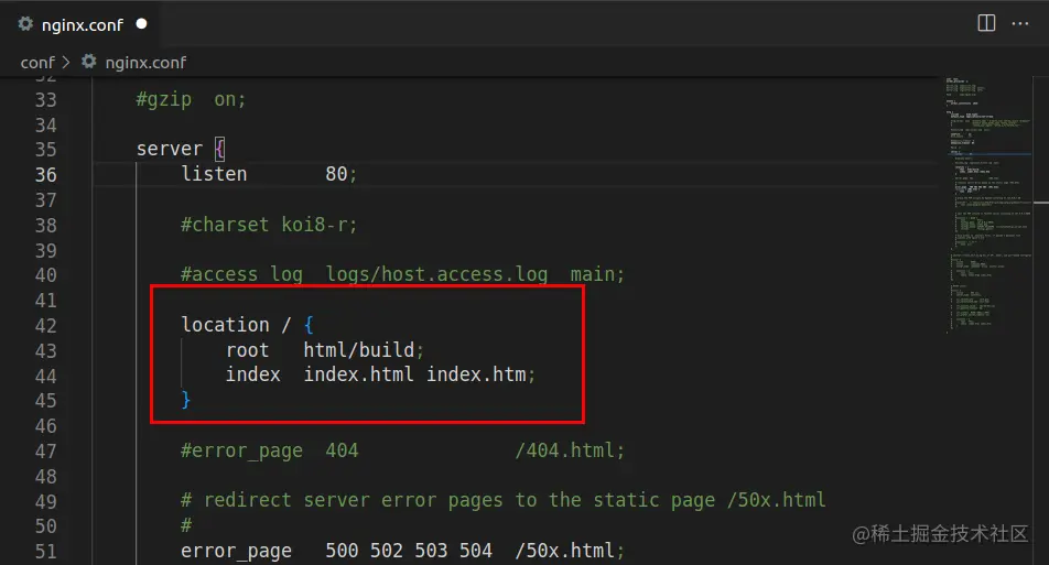 打开/usr/local/nginx/conf/下的nginx.conf配置文件(我使用的是vscode打开的文件),修改该配置文件的内容如下: