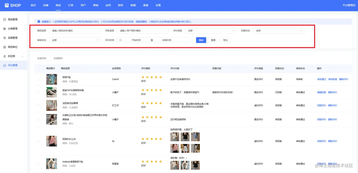 平台管理可以通过输入商品名称/编码等商品信息、用户昵称/编码等买家信息、评价类型、回复状态、审核状态、评价时间等搜索查询用户评价,如下图所示: