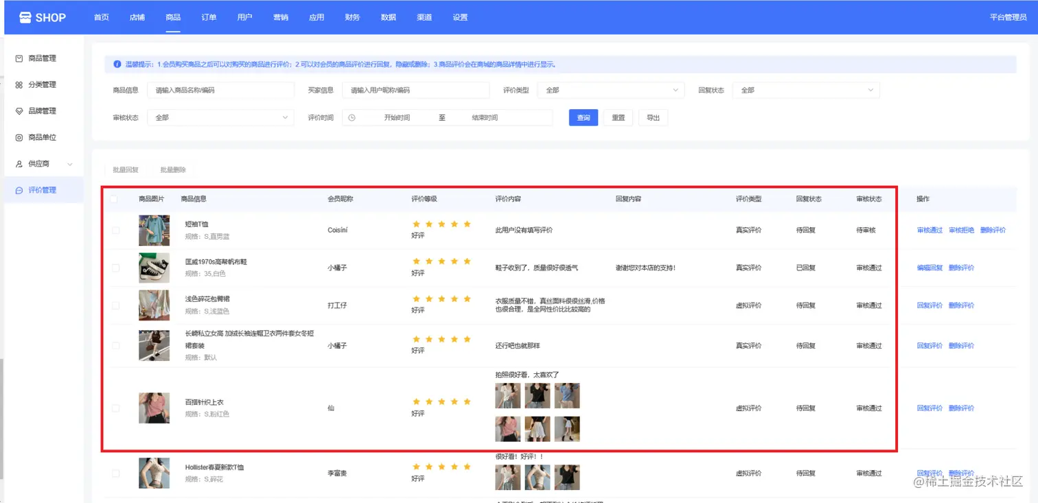 下面可以看到商品图片、商品信息、会员昵称、评价等级、评价内容、回复内容、评价类型、回复状态、审核状态等,如下图所示: