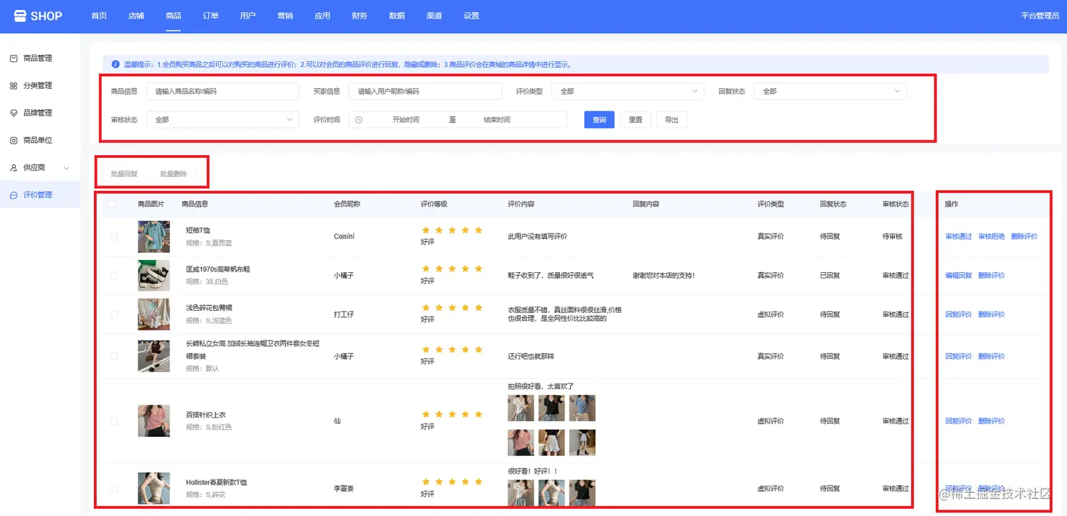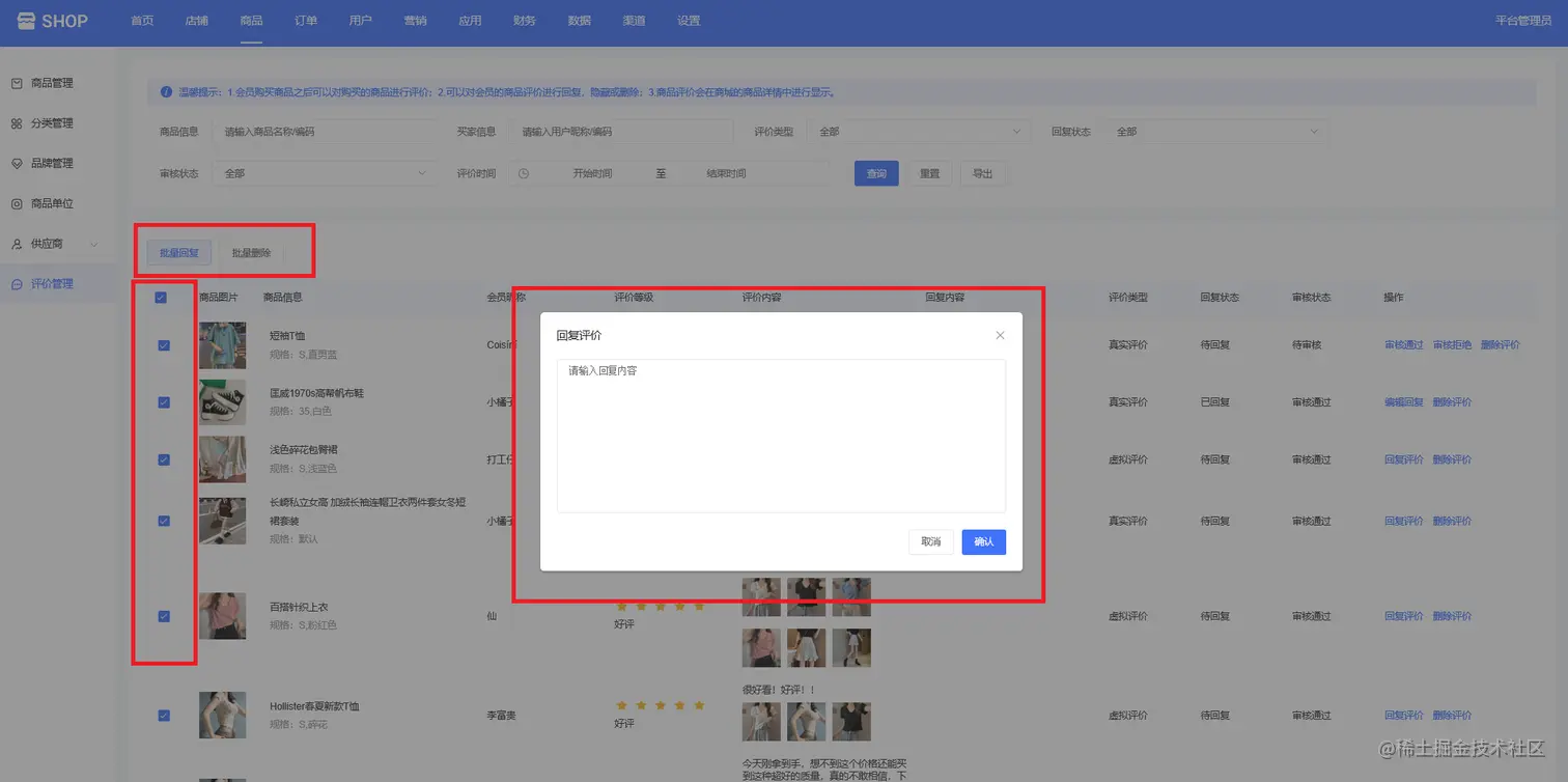 平台管理可以勾选评价信息,批量回复或者批量删除评价信息,如下图所示: