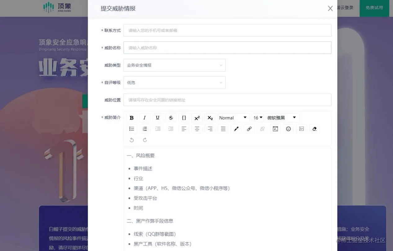 威胁情报提交包括风险概要、黑产作弊手段以及黑产变现链路。