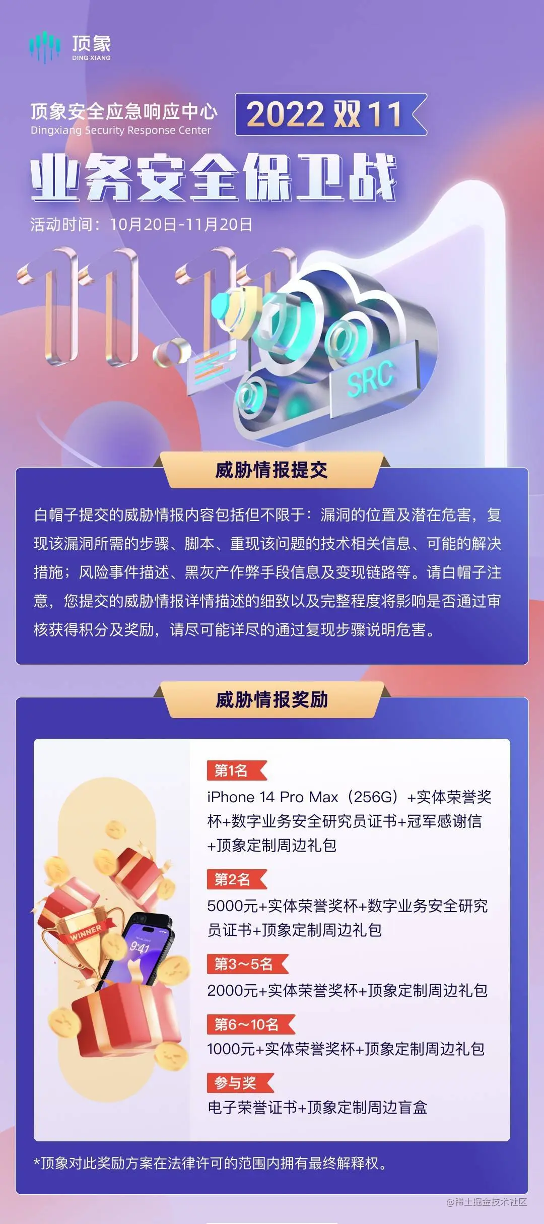 双十一期间,白帽黑客可在顶象安全应急响应中心提交漏洞&威胁情报(所谓威胁情报即将在双十一中的黑灰产“抓起来”,描述黑灰产的风险来源、风险特征、作弊手段、变现链路,形成业务安全威胁情报),经顶象安全应急响应中心工作人员验证成功,核定审核结果并给予相应的积分评定,积分排名在前10 的选手可拿到高额奖金及其他丰厚福利,前3名获得者亦可作为升职加薪的有利条件之一。