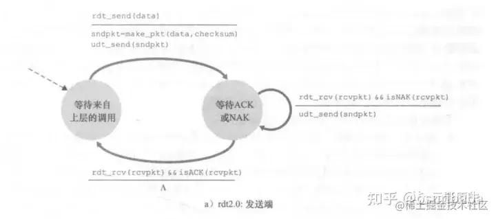 下图为自顶向下方法中,rdt1.0 协议的状态机表示图(rdt 的意思就是可靠传输),“rdt_send” 这个 action 可以触发 “make_pkt” 以及 “udt_send” 这两个行为,上面的代码大致实现的就是这几个操作。