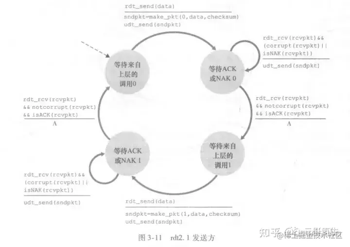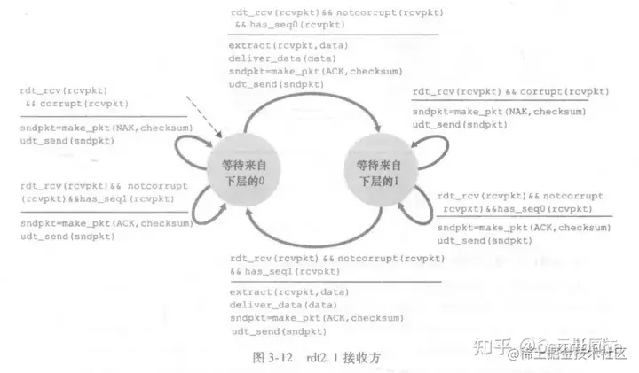 由于 rdt2.2 和 rdt2.1 协议的变化并不是很大,基本原理都是一样的,只不过通过将 seq 的序号添加给 ACK 报文来替代 NAK 报文而已。也就是说原来是通过 ACK 和 NAK 两种报文来表示接收成功还是失败,现在可以通过 ACK0 和 ACK1 来替代原来的所有功能了。