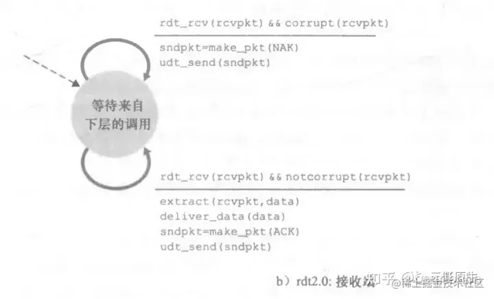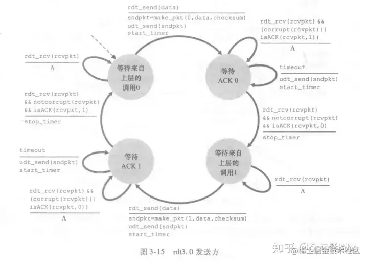 首先上层应用触发了 rdt_send 操作,然后通过 make_pkt 构建 seq0 以及带有 checksum 的请求报文,然后触发 udt_send 方法发送数据,当数据发送过后开启一个倒计时定时器(注:这里的定时器要设置多长时间,需要根据数据包的往返时间以及网络中的拥堵情况动态计算。)