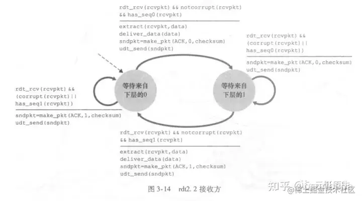 优化过后的协议可以称它为 rdt2.2,我们来看一看 rdt2.2 的客户端以及服务端的状态机: