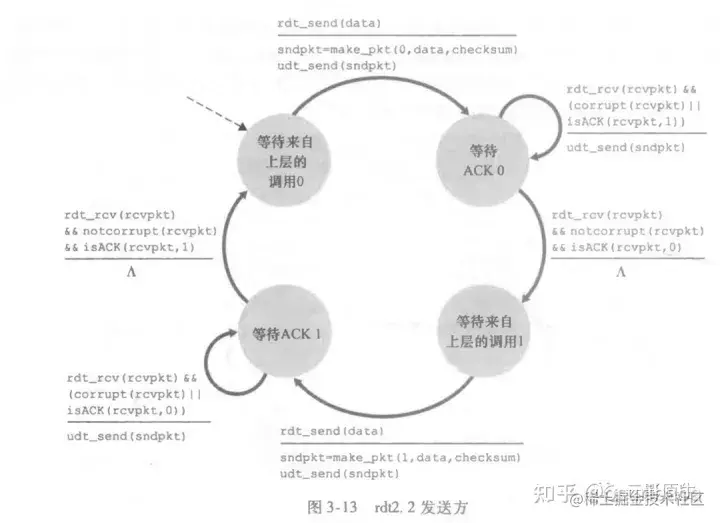 在 rdt2.2 中,和 2.1 的差别不大,就是服务端需要返回给客户端带有序号的 ACK 报文,客户端可以只保留 corrupt 以及 not_corrupt 两个用于处理成功和失败的行为。差别不大也不太难,大家可以自己悟,不多说了~