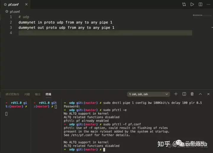 接下来我们采用上面测试 rdt1.0 时的 dnctl 命令创建一条拦截流量的 pipe,然后再使用 pfctl 工具将 udp 流量导入到这条 pipe 中,之后运行客户端和服务端查看效果: