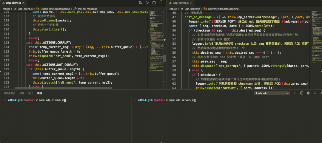 至于 rdt3.0 的服务端,可以完全采用 rdt2.2 的代码无需改动,因为在 rdt2.2 中已经实现了处理冗余数据报的场景。