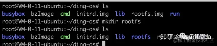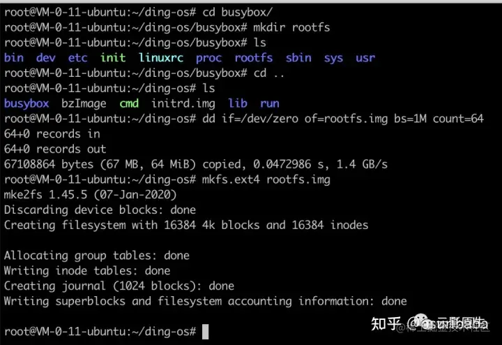 - 目前到这里 initramdisk 就算是创建好了,接下来还要创建真正的 rootfs。可以在 busybox 目录下创建一个 rootfs 姆露露,然后使用 dd 命令创建一块儿虚拟磁盘空间,并给它格式化为 ext4